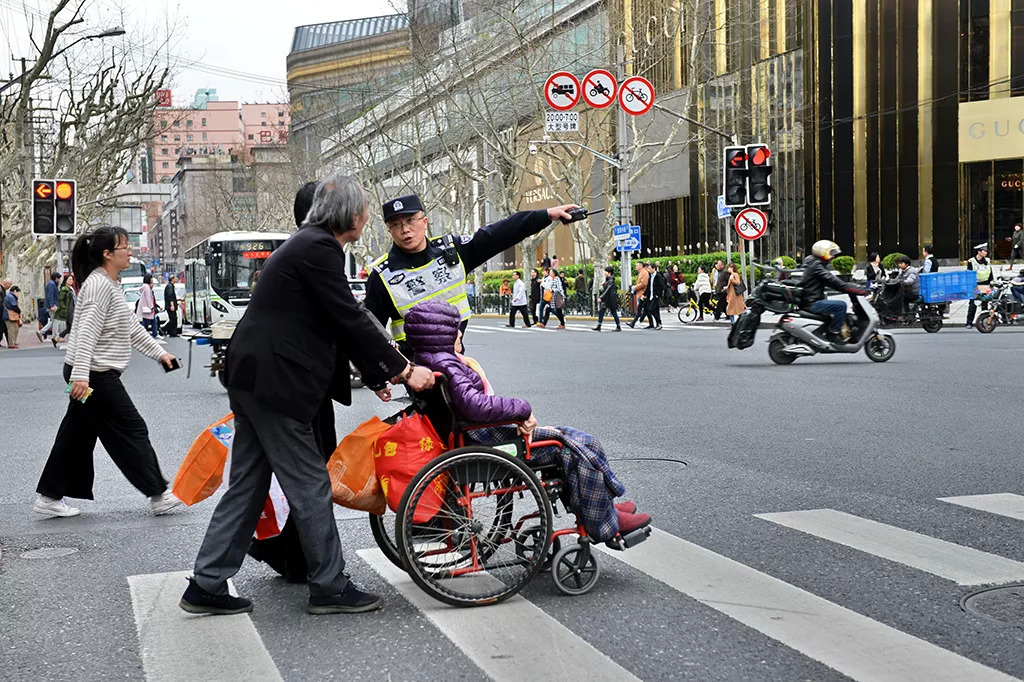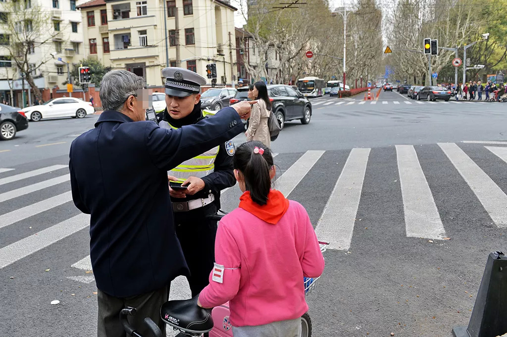 3月29日下午15时30分左右,衡山路上一位老年人士驾驶非机动车带着孩子在人行道内骑行,王润达上前将其拦下。