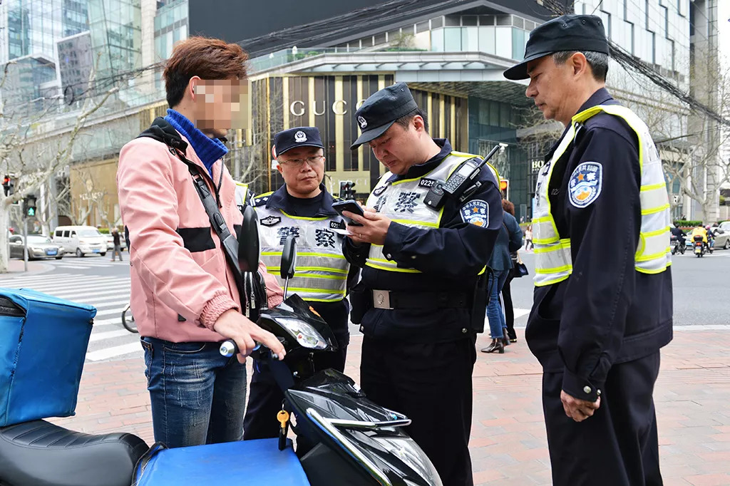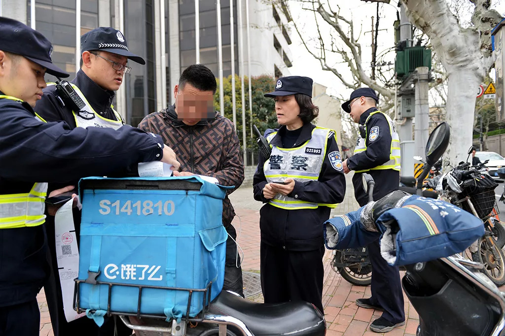 3月30日上午,淮海中路上一“饿了么”外卖小哥驾驶非机动车在人行道上闯红灯,湖南路派出所民警张仁乐上前将其拦下。