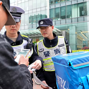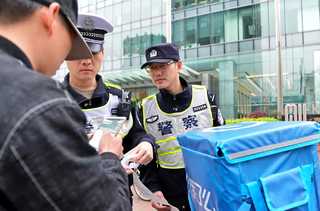 “别着急走,你刚才闯了红灯,完成订单对你来说很重要,但是你也必须对自己和他人的安全负责!生命对谁来说都只有一次,我必须根据交通安全法规对你进行处罚。还有,你这个车子在送单的位置不好停车,你把车子停在这里,先去把订单送过去,再回来接受处罚……”