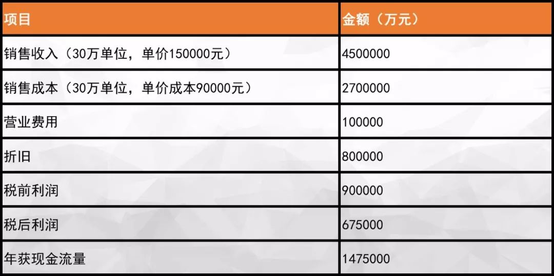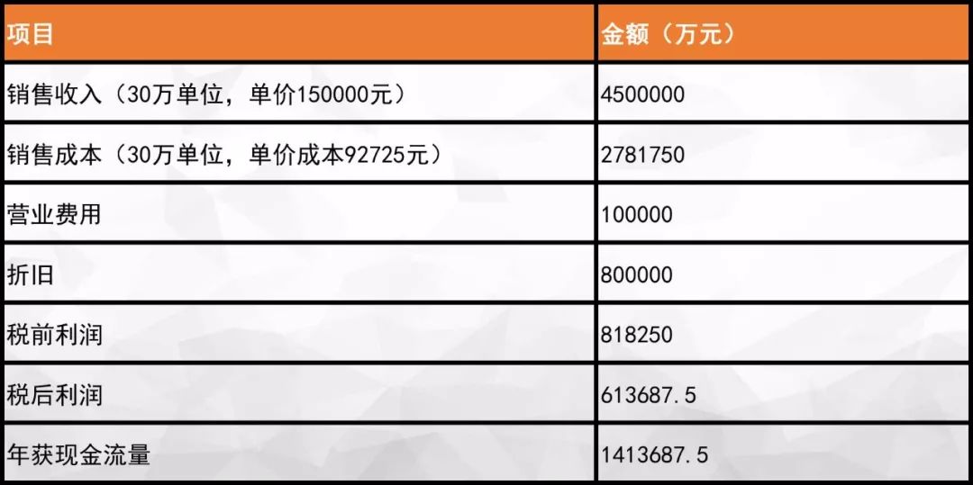 假设:B企业完全国外进口零部件,在国内组装成品车。以汇率为1美元=6.458人民币。假设单台车平均生产成本是90000元,生产一台车耗费进口原材料68500元,其它材料加成本累计是21500元,单车平均销售价格150000元,销售总数是30万台,假设所得税率是25%,B企业业绩如下图:
