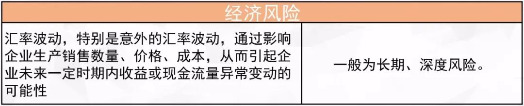 经济风险是指汇率波动,特别是意外的汇率波动,通过影响企业生产销售数量、价格、成本,从而引起企业未来一定时期内收益或现金流量异常变动的可能性,一般为长期、深度风险。