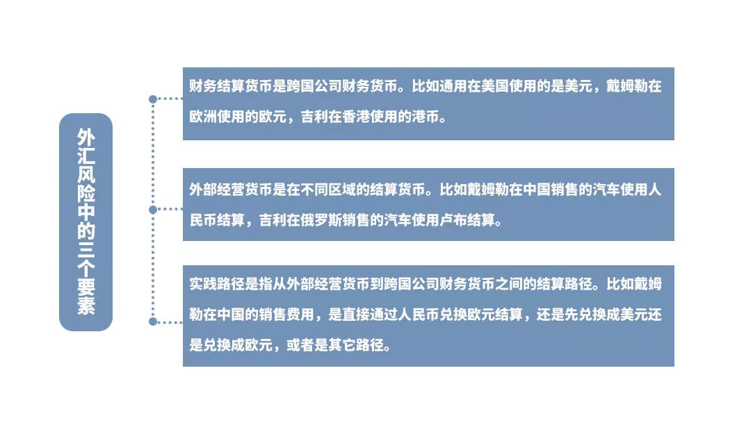 在传统经济学模型中,有关于利率变化带来的财务风险,统称为外汇风险。外汇风险中包含了财务结算货币、外部经营货币和实践路径三个要素: