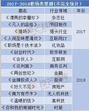 下图是【锋芒智库】整理的2017-2018年在电视平台播出的职场类型剧。在受众圈层上可以分为三种:刚入职场的菜鸟生存类《漂亮的李慧珍》;创业者的心路历程类《创业时代》《合伙人》《南方有乔木》;熟男熟女世界的商战圈类《你和我的倾城时光》《温暖的弦》《好久不见》《猎场》等等。
