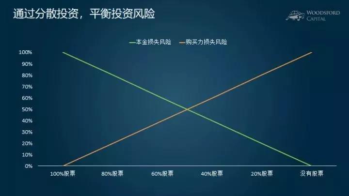 如上图所示。假设投资者把所有资金都投入股票(上图左侧)。他有效消除了购买力损失风险,但却需要承担最大的本金损失风险。如果投资者走到另一个极端,把所有钱都放在银行里(上图右侧),那么他有效消除了本金损失风险,但却需要承担购买力损失的风险。