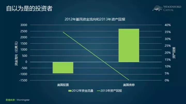 举例来说,2012年,绝大部分投资者普遍对股市看空,因此他们选择卖出股票基金(净流出1000亿美元左右),买入债券基金(净流入2500亿美元左右)。