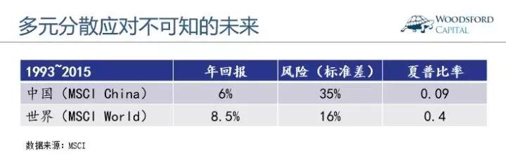 上图显示的是过去22年(1993~2015)中国股市(MSCI China)的历史回报和风险,以及同期世界发达国家股市(MSCI World)的历史回报和风险。