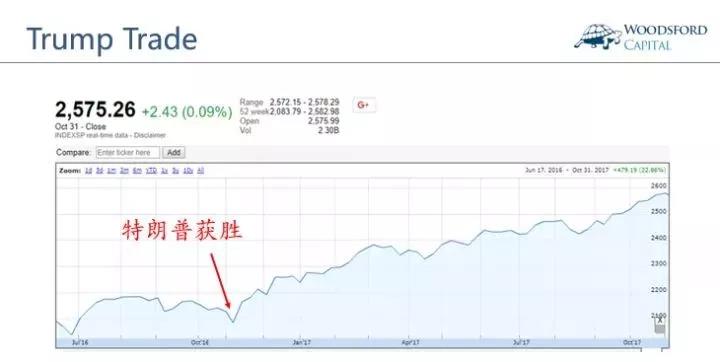 上图显示的是美国S&P 500股票指数在特朗普胜选后的价格变化历史。在特朗普获胜后,美国股市不光没有下跌,反而持续走高。在特朗普当选美国总统一年后,美国股市上涨了20%多。