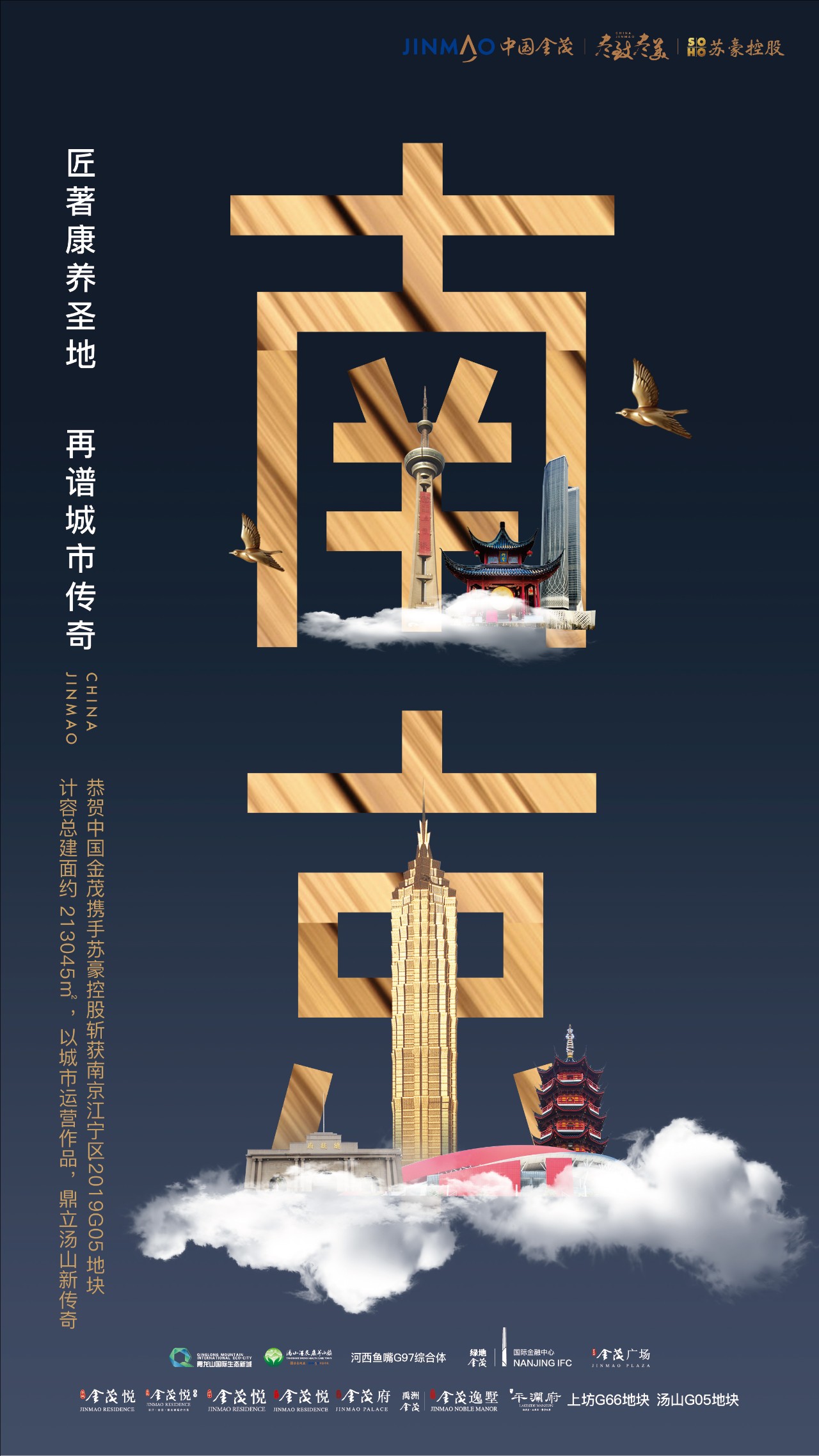 2019年3月29日,金茂携手省属国企苏豪控股,成功斩获南京江宁区NO.2019G05地块,计容总建面约213045㎡,联袂共筑南京首座温泉康养小镇。