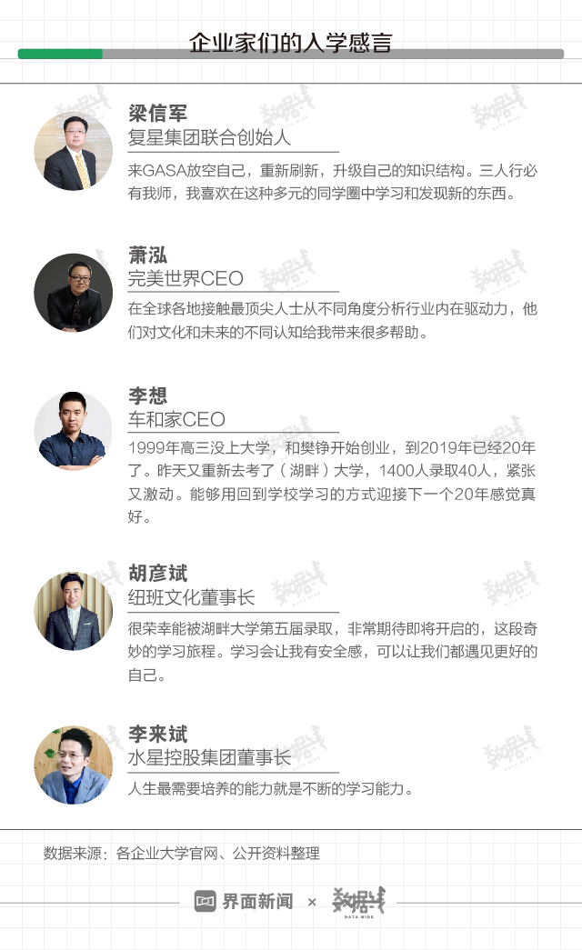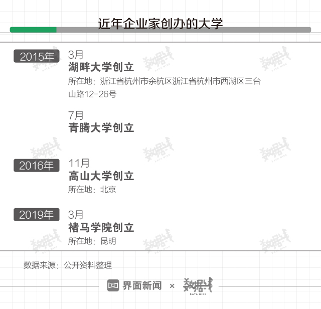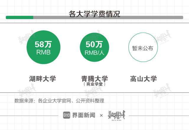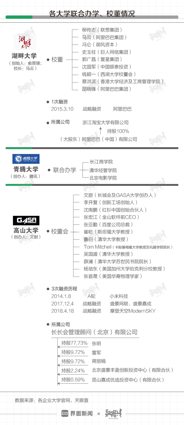 近年混迹商圈的企业家们开始经营起了“大学”项目。既有此前阿里巴巴系湖畔大学(2015年3月)、腾讯系青腾大学(2015年7月)、获小米融资的高山大学(2016年11月)相继创办成立,也有近日由王石、吴晓波出任名誉院长的褚马学院创办成立。同时,求学热也在蔓延,既有2018年OFO创始人戴威入选高山大学,也有近日纽班文化董事长胡彦斌入学湖畔大学。企业家办大学,谁在背后出资?谁又在贡献学费?
