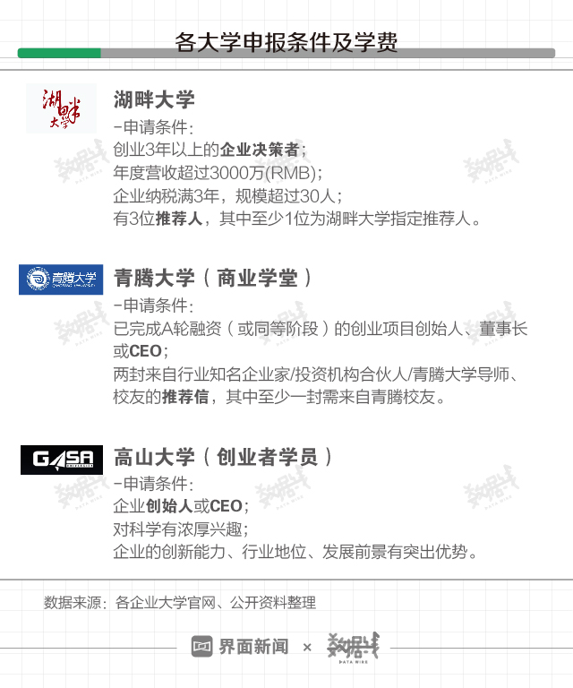 同时,除高山大学外,湖畔大学和青腾大学均设有推荐制。申请湖畔大学需要3位推荐人,且至少1位为湖畔大学指定推荐人。申请青腾大学需要准备两封推荐信,其中至少一封来自青腾校友。因此交得起学费,并不意味着获得申请资格。