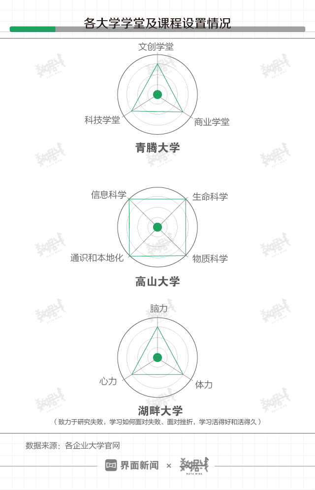 企业家大学安排有哪些课程?据青腾、高山、湖畔3家大学官网,青腾大学下设商业学堂、科技学堂、文创学堂,具体课程因学堂制宜。高山大学共划分信息科学等5个模块。湖畔大学的课程设置最直白:心力课程、脑力课程和体力课程。