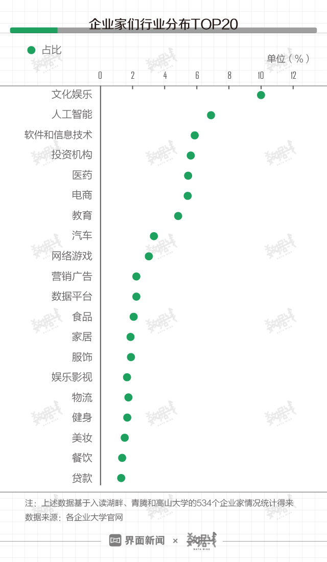 界面数据(公众号ID:shujuxian_kuaikan)统计了其中534名企业家(有详细说明)的行业情况后发现,超十分之一的企业家来自文化娱乐行业,其次是人工智能行业。