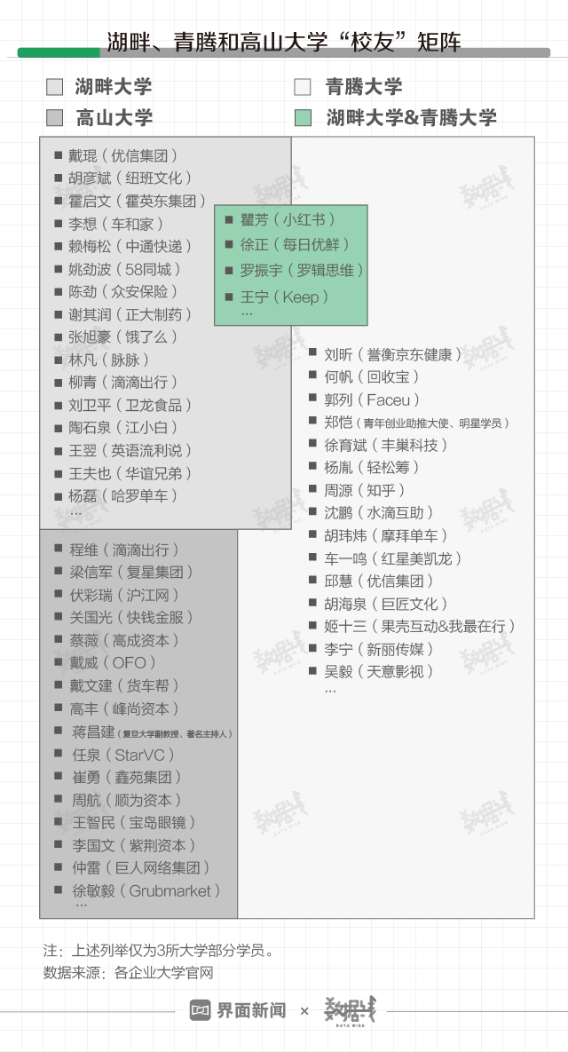 随着求学企业高管日渐增多,各家“校友”版图也在日渐扩张,学校间的关系网日渐复杂且存在交叉。据界面数据(公众号ID:shujuxian_kuaikan)不完全统计,小红书瞿芳、每日优鲜徐正、逻辑思维罗振宇和Keep王宁等商界名人最爱“上学”,他们既游走于湖畔大学,也兼具“青腾”背景。