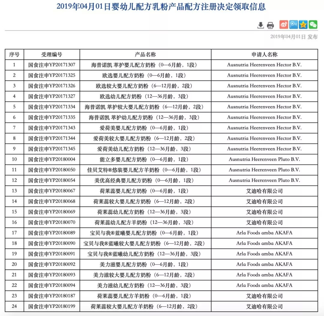 刚刚,《2019年04月01日婴幼儿配方乳粉产品配方注册决定领取信息》正式发布,这意味着最新一批婴幼儿奶粉配方注册获批的名单正式“官宣”,包括来自Arla、艾迪哈、Ausnutria Heerenveen Hector B.V. 3家企业的24个配方!