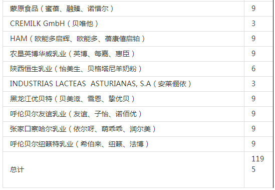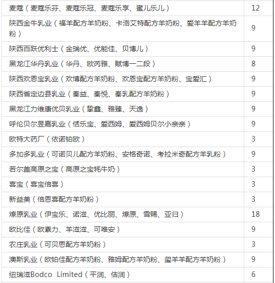 此前有统计数据显示,截至10月17日,国家市场监督管理总局已受理207家企业共计1656个奶粉配方的注册申请,已批准155家企业的1195个配方注册申请(见下表)。其中,已批准境内企业108家共计915个配方,已批准境外企业47家280个配方。此外,申请变更注册的配方有168个。
