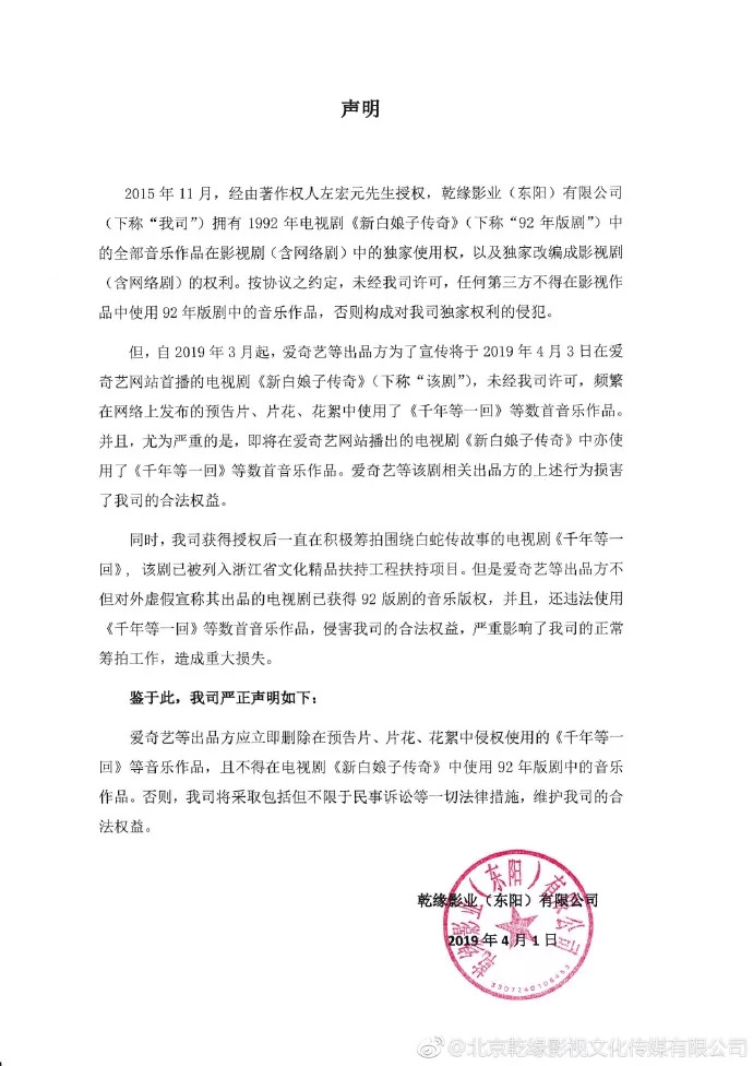4月1日,乾缘影业在其官方微博发布了声明。声明中写道“2015年11月,经由著作权人左宏元先生授权,乾缘影业(东阳)有限公司拥有1992年电视剧《新白娘子传奇》的全部音乐作品在影视剧(含网络剧)中的独家使用权,但自2019年3月起,爱奇艺等出品方为了宣传将于4月3日在爱奇艺网站首播的电视剧《新白娘子传奇》,未经我司许可,频繁在网络上发布的预告片、片花、花絮中使用了《千年等一回》等数首音乐作品。”