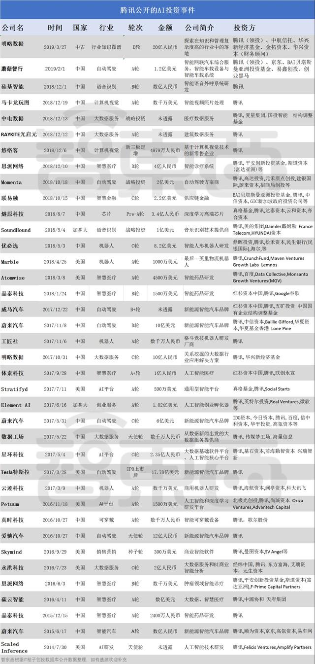 这些投资看来似乎并没有太多逻辑,但也都是人工智能领域中非常重要的组成,提早以投资的方式小规模布局于腾讯而言,无疑是一笔划算的生意。