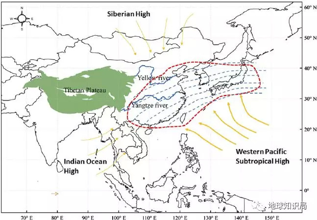 于是,在清明时节,位于太平洋的副热带高气压带(跟屁虫一)便会加强西伸,同时西南风(跟屁虫二)也开始向北扩大影响力。在两者的作用下,海洋上的暖湿水汽就会随之输送到我国大陆地区,从而带来丰沛的降水。