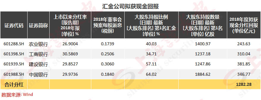 这些股东从银行历年分红中赚得盆满钵满。根据Wind数据,工、农、中、建第一大股东都是汇金公司,持股比例分别为34.71%、40.03%、64.02%、57.11%,持股数分别为1400.97亿股、1237.18亿股、1247.86亿股、1884.62亿股,按照2018年度分红预案计算,汇金可从四大行获得1282亿元(税前)的现金回报,超过去年的1000亿元(税前)。
