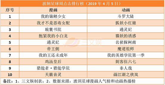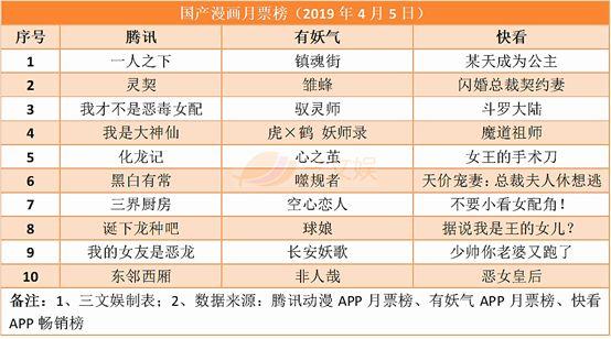 国产漫画方面,截止2019年4月5日,腾讯动漫APP漫画板块的周月票榜有一定的变化。上周排名榜首的是米二创作的都市灵异漫画《一人之下》,这部作品讲述了少年张楚岚为解开爷爷和自身秘密和没有任何记忆“不死少女”冯宝宝开启“异人”之旅的故事,上周月票数为5655票。新晋榜单《三界厨房》是徒子文化旗下的作品,上周排名第七,周月票数为1900票。新晋榜单《我的女友是恶龙》是黎之恒创作的玄幻恋爱漫画,讲述了一个东方少年在西方大陆拯救恶龙公主后发生的一系列故事,上周排名第九,周月票数为1452票。新晋榜单《东邻西厢》是电鳗工作室与燃也文化出品的京剧题材漫画,上周排名第十,周月票数为1417票。