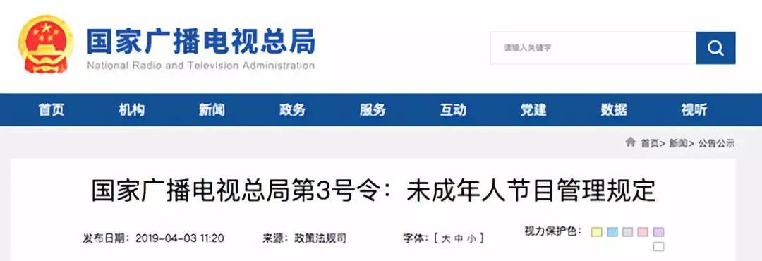 4月3日,国家广播电视总局发布消息,《未成年人节目管理规定》已经2019年2月14日国家广播电视总局局务会议审议通过,现予公布,自2019年4月30日起施行。