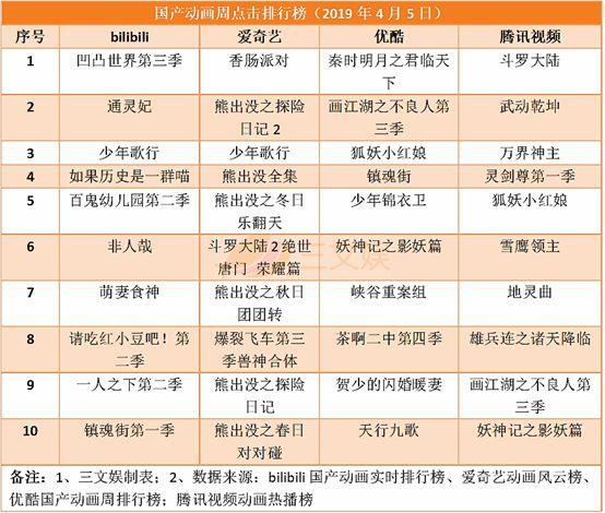 腾讯视频方面,截止4月5日,改编自中国作家唐家三少原作的同名玄幻小说的网络动画《斗罗大陆》上周排名第一,这部作品讲述了讲述了唐门外门弟子唐三穿越到斗罗大陆,在这片武魂的世界再铸唐门的辉煌的故事,目前总播放量为63.3亿。新晋榜单《画江湖之不良人》是若森数字出品的大型三维武侠动画,讲述了前朝皇子李星云欲归隐山林,不良帅决心挟天子以令诸侯,号召江湖各大势力复辟大唐的故事。目前总播放量为6.3亿。
