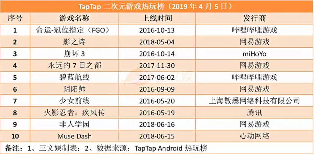 在TapTap Android二次元类游戏热玩榜方面,上周由bilibili发行的角色扮演类手机游戏《命运-冠位指定》排名第一,目前关注人数超过132万,评分为7.4分。新晋榜单《影之诗》是由Cygames开发的一款集换式卡牌游戏,国服由网易游戏代理,目前关注人数为29万,评分为7.4分。新晋榜单《影之诗》新晋榜单《永远的7日之都》是网易制作发行的角色扮演类游戏,目前与魔卡少女樱开展联动活动,关注人数为124万,评分为8.2分。新晋榜单《Muse Dash》是心动网络发行的一款集跑酷+音乐为一体的手游,目前购买人数达到40万,评分为9.6分。