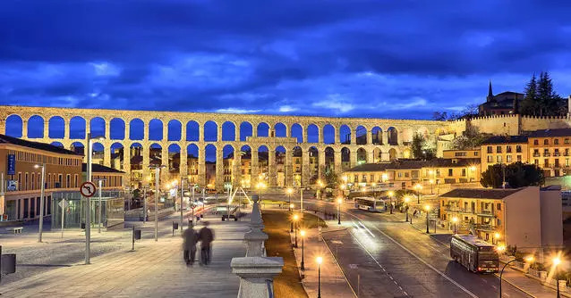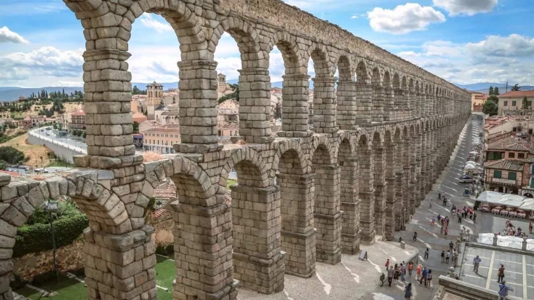 古罗马引水渠:罗马大渡槽建于古罗马图拉真大帝(公元53-117年)时代,至今完好。塞戈维亚渡槽用土黄色花岗岩干砌(不用灰浆)而成,坚固异常。渡槽全长813米,分上下两层,由148个拱组成,高出地面30.25米,气势非凡。最初罗马人建造这座渡槽的目的,是将18公里外的弗利奥河水引入城内饮用。