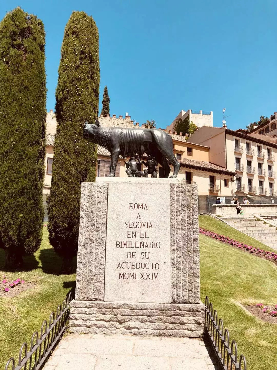 著名的“母狼乳婴”是古罗马城的图腾和市徽。传说公元前七八世纪时,罗马国王努米托雷的两个外孙罗慕洛和雷莫曾被一只母狼用奶汁哺育成活,以后罗慕洛建造了罗马城,将“母狼乳婴”图案定为罗马市徽,因而罗马又被称狼城。在母狼脚下的石碑上刻着西班牙文字,大意为“在塞戈维亚的罗马两千年的引水渠”。