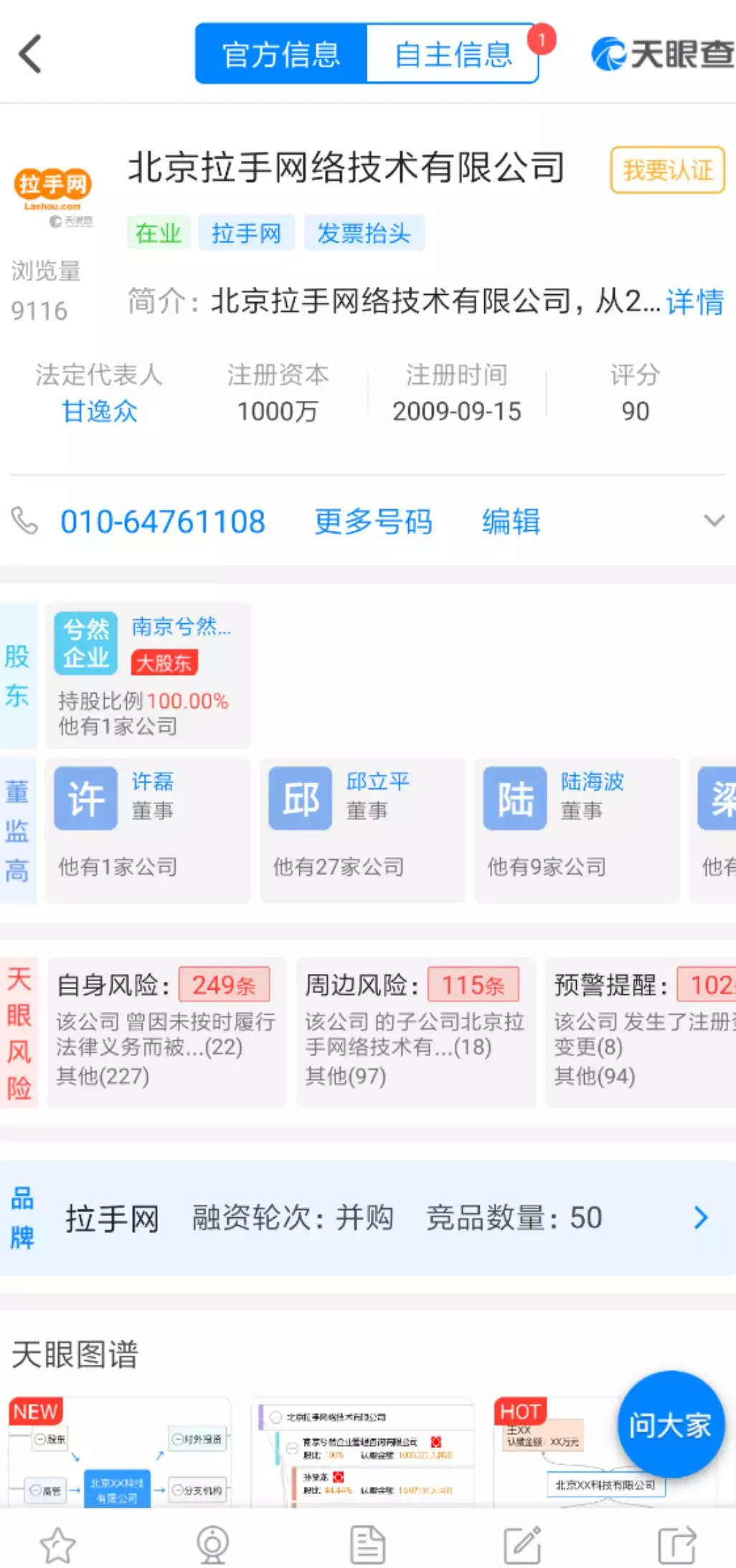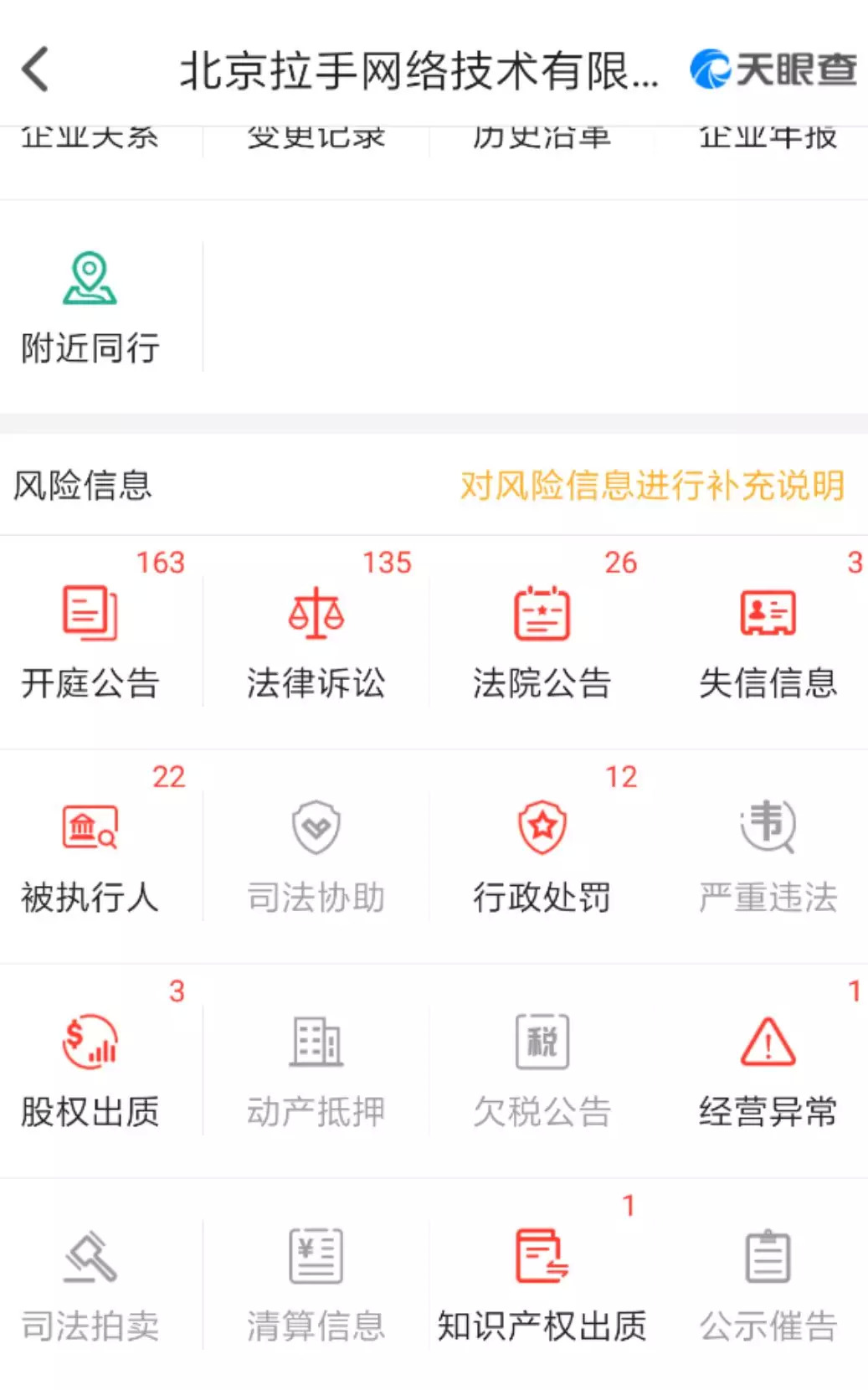 如今,虽然拉手网在工商信息的营业状态显示在业,但据天眼查风险显示,拉手网自身风险达249条,周边风险115条,预警风险102条。其中,公司涉及开庭公告163次,法律诉讼高达135次,法院公告26次,被执行人22条,行政处罚12条,失信信息和股权出质均高达3次。