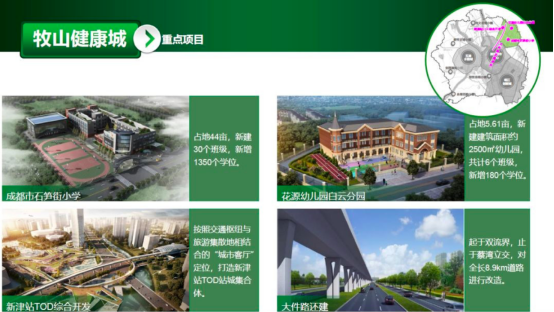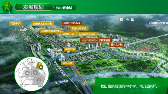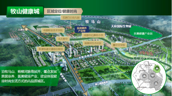 作为新津与双流衔接的牧马山区域,历来都是成都高端奢居圈层所在,在最新规划中,规划为“牧山健康城”板块。位于南天府新区与城市绿心板块之间,沿牧马山、杨柳河脉络展开,重点发展旅居康养、医美健康产业,建设体现健康时尚生活方式的高品质城区。