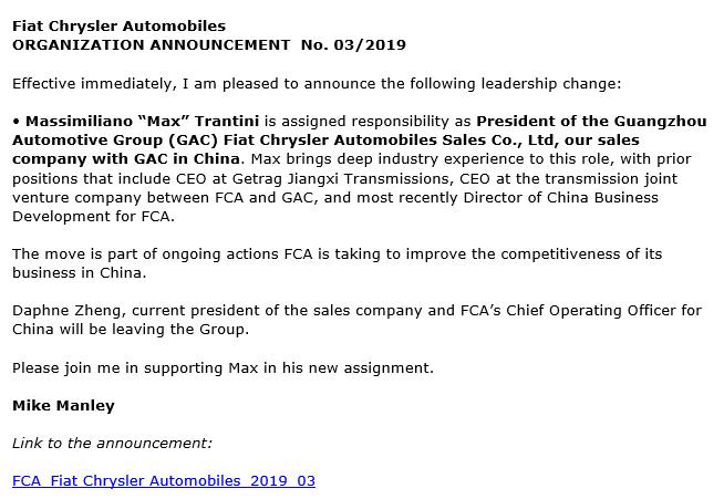 FCA的这一任命使郑杰成为首位跻身世界级汽车集团最高管理层的中国籍华人。