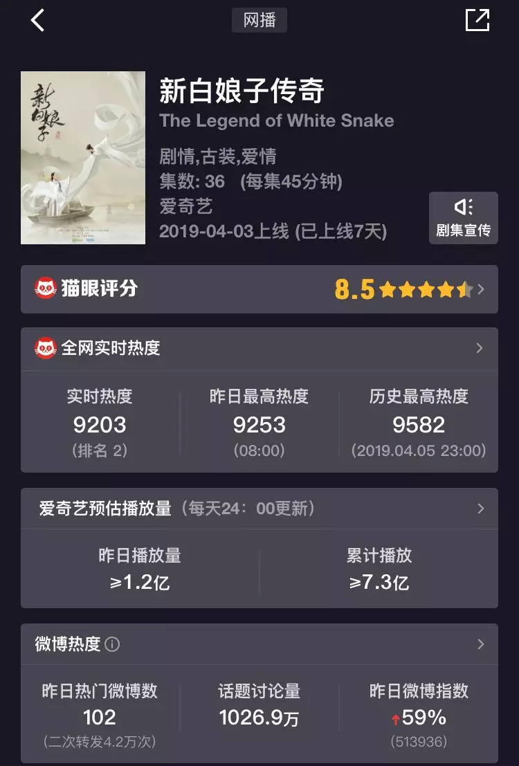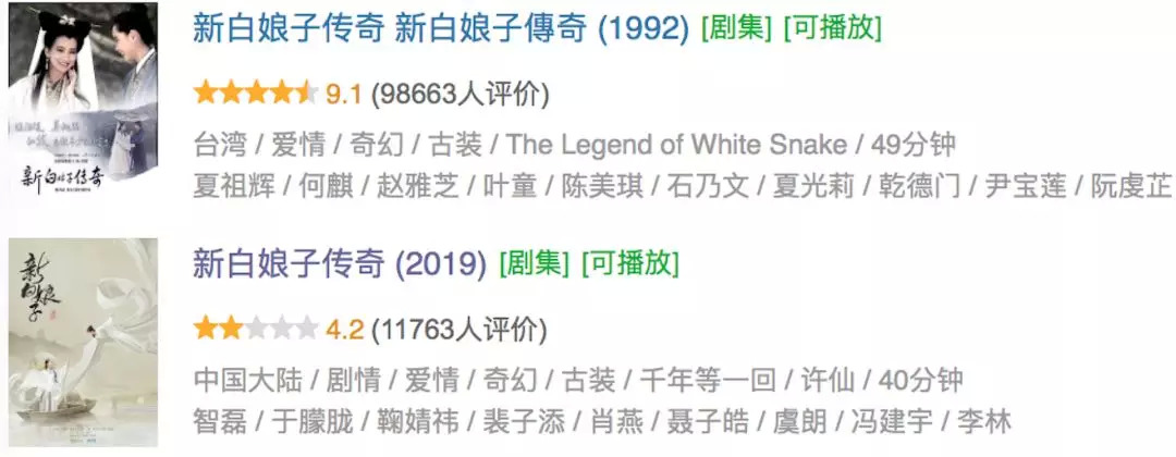 作为2019年近百部翻拍作品的头拨主力军,《新白娘子传奇》上线一周,就迎来了“冰火两重天”。一边面临着豆瓣不及格的评分,