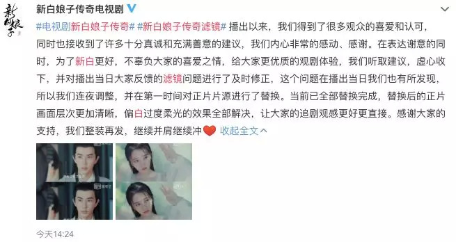 不过今天剧方已经做出了调整,从观众的观剧体验出发,下线了超强柔光,可谓诚意满满。