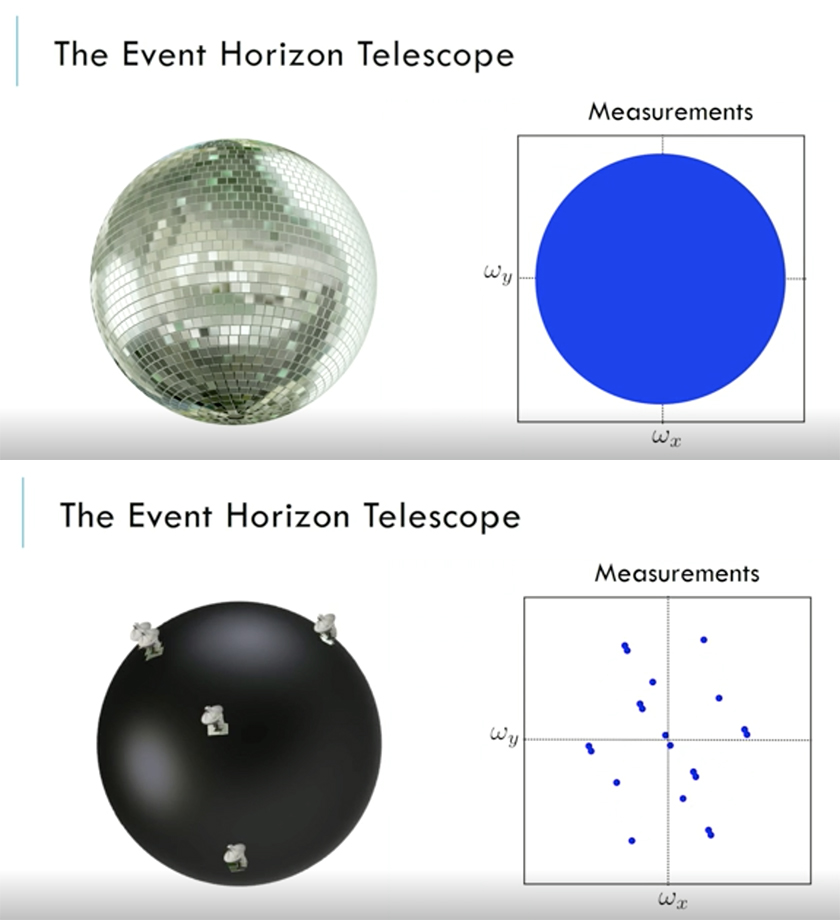 “洗照片”难就难在如何将这8只“眼睛”看到的景象合为一张图像。我们可以将地球大小的望远镜想象成一颗巨大的迪斯科球,每一面镜子收集光线,就可以组合成一幅完整的图像。但由于目前通过VLBI技术接入的望远镜数量有限,“事件视界望远镜”只相当于一颗由数面镜子组成的迪斯科球,必须通过缜密的算法填满空缺的部分,才有可能合成一张黑洞的图像。