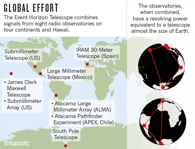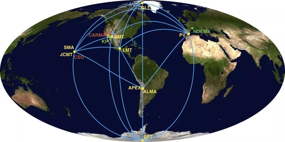 2017年4月5日,由位于南极、智利、墨西哥、美国夏威夷、美国亚利桑那州、西班牙的8台亚毫米射电望远镜同时对黑洞展开观测,利用甚长基线干涉测量技术(VLBI)将这8台望远镜构建成超级“虚拟”望远镜——视界面望远镜(EHT),EHT口径13000公里,约等同于地球直径。