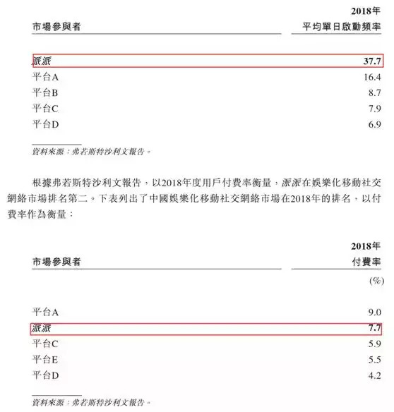 根据弗若斯特沙利文报告显示,2018年在中国所有娱乐化移动社交网络平台中,派派平均单日启动频率位列第一,总共约为每用户37.7次,用户付费率位列第二,总共约为7.7%,人均单日使用时长位列第三,总共约为81.1分钟。