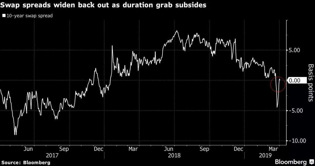 彭博数据显示,2019年3月末,美国10年期互换利差大幅下跌进入负区间,达到17个月未见之水平,而过去一年里它一直都是正值(下图)。