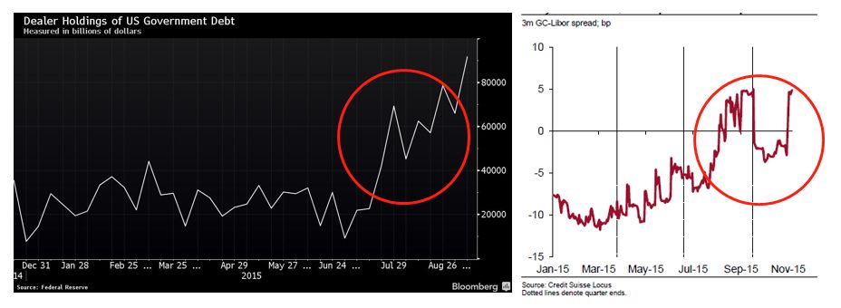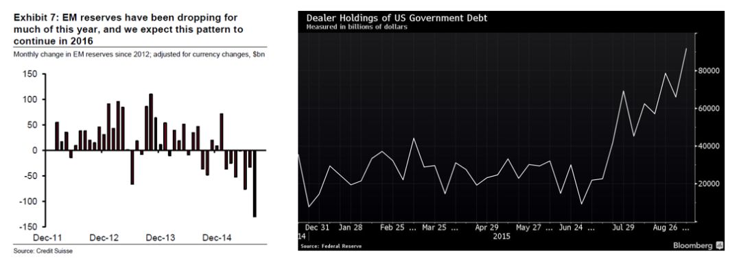 然而在现实中,上述套利交易并没有跟想象中一样发生。首先,最直接的一点是,3m Libor–GC repo利差在2015年7月后就开始迅速收窄并跌入负值(下图右侧面板,注意图中是GCrepo-Libor)。根据当时的市场报价,套利空间已几乎消失。3m Libor–GC repo利差收窄变负的短期原因是新兴市场国家大量卖出美国国债,交易商持有的国债库存增至平均水平的4倍(下图左侧面板),而这些头寸都需要通过Repo进行融资(质出国债换入现金),因此对现金需求的增加导致GCRepo利率飙升。而抵押融资利率上升的长期原因,主要是交易商资产负债表愈发昂贵(下文详述),交易商不愿意置入国债占有资产负债表空间,因此提高回购利率。