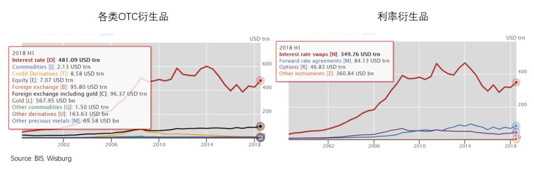 所谓互换利差 (Swap spread) 是指利率互换协议 (Interest rate swap, IRS) 中固定利率报价与同期限国债利率之间的差额。IRS是指使交易双方能够在一段特定时期内互换利率的衍生品协议,通常其中一支是固定利率(Swaprates),而另一支是浮动利率,如3个月期伦敦银行同业拆借利率(Libor)。IRS市场是全球最大的场外(OTC)衍生品市场,是利率风险管理和投资的重要久期来源。根据BIS的半年度OTC衍生品统计数据,2018年上半年IRS的未偿名义本金价值达到了349.76万亿美元(下图)。