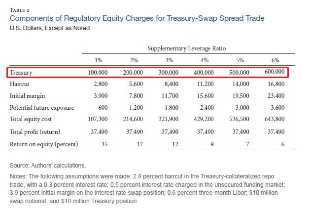 具体来说,Repo交易的名义总金额和折扣率,swap交易的初始保证金和潜在风险暴露 (Potential future exposure, PFE) 都要求交易商在交易前持有SLR下的额外资本金。如下表所示,对于负互换利差套利交易,最大的额外资本来自国债头寸,因为该支出是基于回购融资的全部名义金额,然而,在较高的SLR下,衍生品交易的保证金和PFE所需的额外资本也不容小视。
