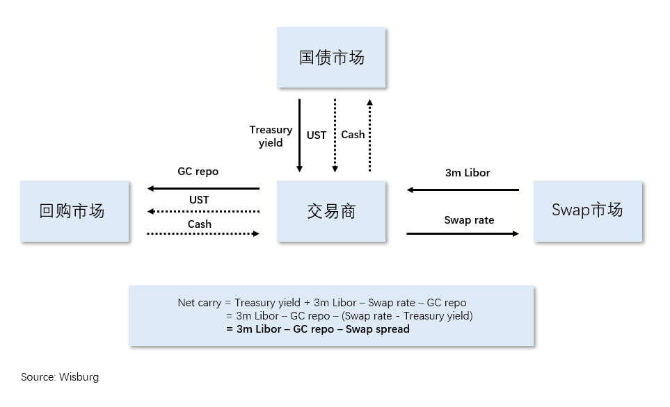 下面这个风格化的流程图清晰地展示这种套利交易的机制。具体来说,套利者可以选择持有长期国债多头,并通过回购交易(GCrepo)为多头头寸融资(下图中虚线),与此同时,再买入期限与之相匹配的IRS合约(支付固定利率)。这样,套利者可以收到3mLibor和国债收益率,并支付GCrepo利率和Swaprate,两部分之差就是套利空间。经过简单代数可知,套利空间 = 3m Libor – GC repo – Swap spread。由于在通常情况下,3mLibor–GCrepo利差为正(因为Libor是无抵押融资,repo是有抵押融资,而且当抵押品为国债时,风险非常低),因此当互换利差Swap spread为负时,存在充足的套利空间。当然,下面的模型有所简化,比如没有考虑折扣率的问题(Haircut,即从回购市场获得的cash小于购买国债UST支付的cash),以及没有考虑和CCP进行IRS交易时支付的保证金(Margin)。这部分资金都需要从无抵押市场融资获得,因此套利者还需要额外支付一小部分融资成本,但总体上并不影响分析。