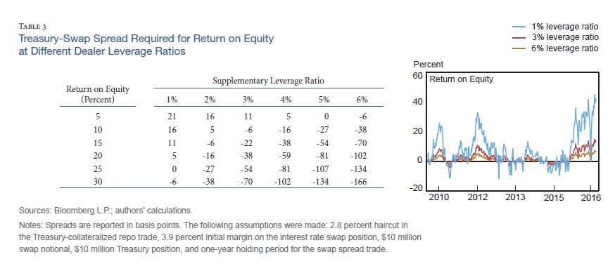 交易商一般都是通过基于某一特定交易的ROE盈利视角来评估交易的可行性,而ROE对资本消耗 (Capital charge) 非常敏感,而资本消耗又对SLR非常敏感。SLR上升或下降一个百分点都可能产生巨大影响。事实上,根据纽联储的估算,ROE受SLR的影响是非线性的,当SLR从3%提高到6%,ROE就出现了剧烈的下滑(下图右侧面板)。这种较高的成本有助于解释为什么受到监管的交易商不太可能去套利,除非互换利差达到比过去负得多的水平,这样即使有资本消耗,交易也变得划算(下图左侧面板)。不过,在2015年10月后,10年期互换利差平均也只有-11个基点。