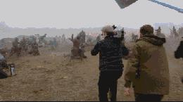 的确是实拍,但现场并不像最终画面表现得那般“紧急”:剧组这里利用远摄镜头,压缩了背景与前景画面之间的景深,造成骑兵阵列与囧雪很贴近的假象;其实,没准他们此时还相隔百米之外。