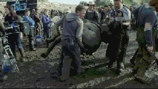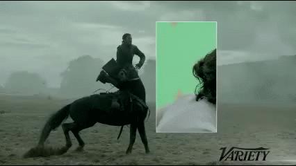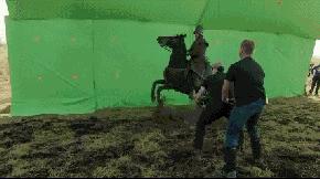 像这个巨人“温温”掀翻一匹战马的镜头,就是在绿幕前拍摄,通过后期合成数字战马、以及实拍外景来实现的。