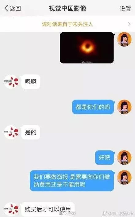 有人咨询视觉中国客服,得到的答复是,视觉中国确实拥有黑洞版权,而且需要购买后才能使用。