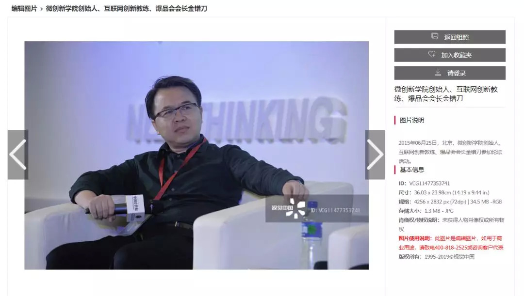 刀哥咨询了版权相关人士后,其表示,视觉中国一直在钻空子,比如他用刀哥的这张照片,旁边标注虽未获得人物肖象权和所有物权,但他用作商业用途时(找我们收钱),实则已经侵犯了我的肖像权。