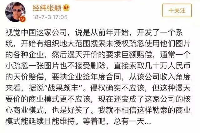 张颖当时指出,视觉中国漫天开价索要几十万人民币巨额赔偿,要挟企业签年度合同: