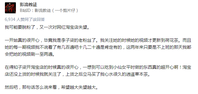 产品对网红而言,也起到为其声誉而背书的作用,一旦出现问题,也能让网红前期的引流功亏一篑。被誉为“2017第一网红”的美食网红李子柒,在成功圈粉之后,开设了以自身为品牌的天猫店,视频里的她精心制作的美食让人垂涎三尺,视频外的天猫店买的食品大多是外包给流水线工场,品牌的溢价后面,是想象与现实的落差,掏钱买了失望的粉丝,纷纷在