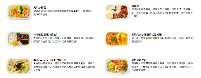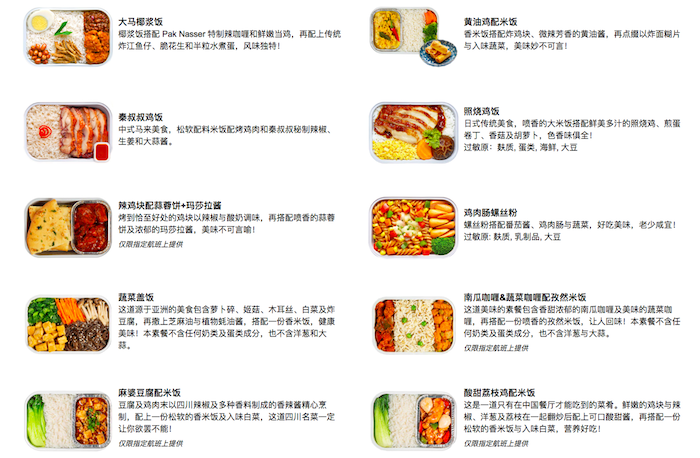机上的菜单每三个月会更换一次。如果你从国内出发,那么就尽情享受北京炒饭、上海鲜虾粥、香港烧鸭腿饭和成都的担担面吧。
